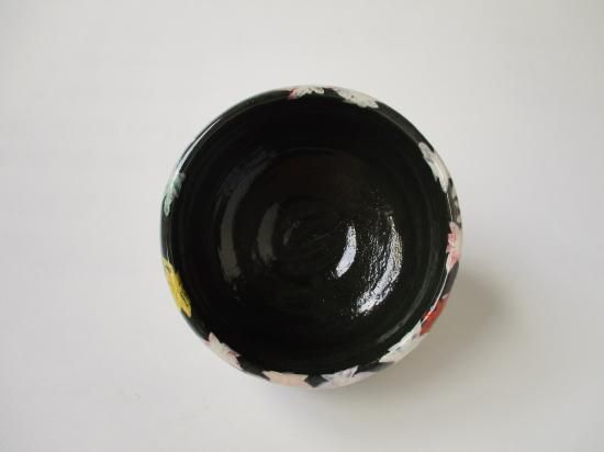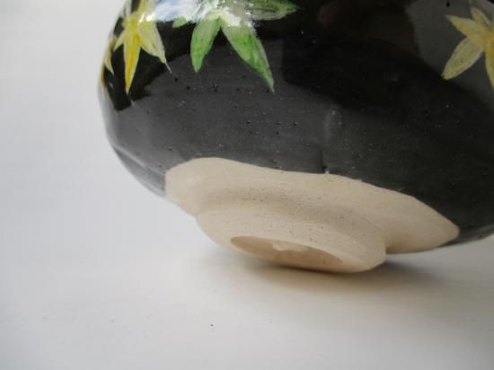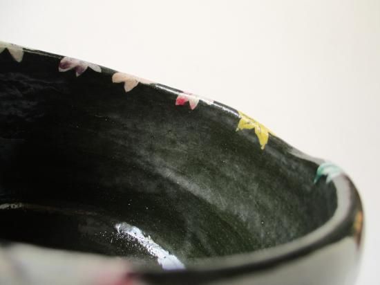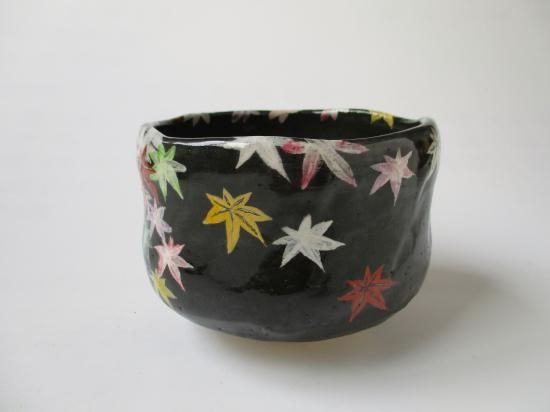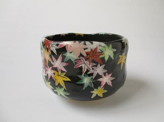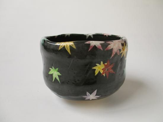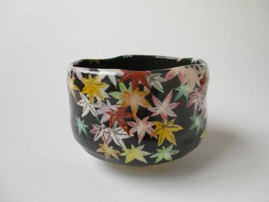 楽焼のもつ温かみのある黒にカラフルな色彩の紅葉が全体にバランスよく描かれていて雅な雰囲気を醸し出しています。