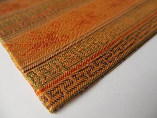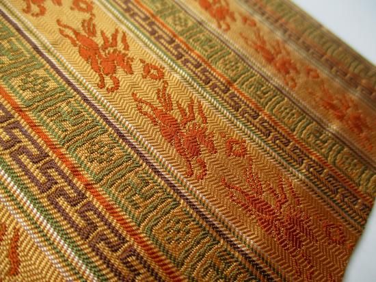 幾何学文と天馬紋を交互に段織されており、紹巴織のやわらかな風合いと落ち着いた色調で品格のある裂地です。