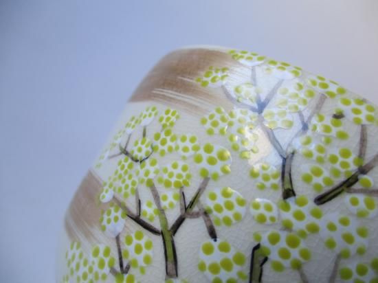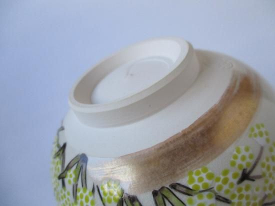 優しい色合いとタッチで三又(ミツマタ)が描かれていて、金彩で霞を表現してあり幻想的な雰囲気を醸し出しています。